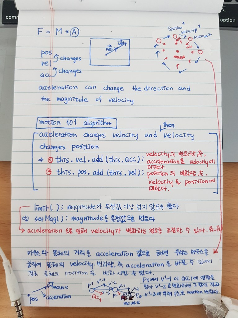 오늘은 가속도에 관하여 공부하고 있습니다. 네, 오늘도 저녁에 일단 포스팅을 해 놓고 남은 공부내용을 밤에 덧붙이려고 합니다. 밤 12시 마법이 풀리기 전 포스팅을 먼저 해 놓겠습니다^^*. position을 변화시키는 것은 velocity이고 velocity를 변화시키는 것은 acceleration입니다. 작용 순서는 거꾸로입니다. (1) acceleration이 velocity를 변화시키고 (2) 변화된 velocity가 position을 변화시킵니다. 이 작용 순서를 < Motion 101 Algorithm>이라고 합니다. 이를 바탕으로, 마우스를 움직여 물체의 위치를 변화시키는 프로그램을 만들어 보고자 합니다. 아래를 클릭하여 동영상을 보시고, 노트 내용을 참조하셔도 좋을 듯 합니다.