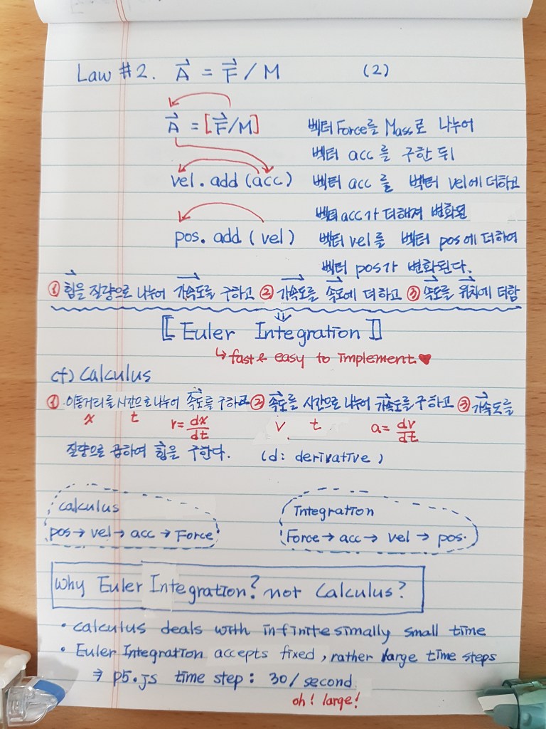 오일러 적분은 초당 30개의 시간간격이 발생하는 p5.js의 화면변화처럼, 큰 단위 (30/sec)의 시간을 다루기에 적합합니다. 그래서, 표현할 수 없을 정도록 아주 미세한 시간을 다루는 미분법이 아니라, 오일러 적분을 사용해서, 사람 눈에 자연스럽게 표현하기에 쉽고 빠른 알고리즘을 기반으로 프로그램을 만들어 볼게요~^^* 방법은~