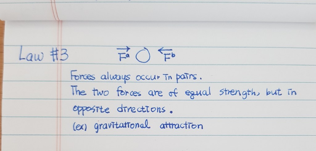 Force Law #3: 같은 크기이면서 서로 반대방향으로 작용하는 한 쌍의 힘이 항상 물체에 작용합니다.