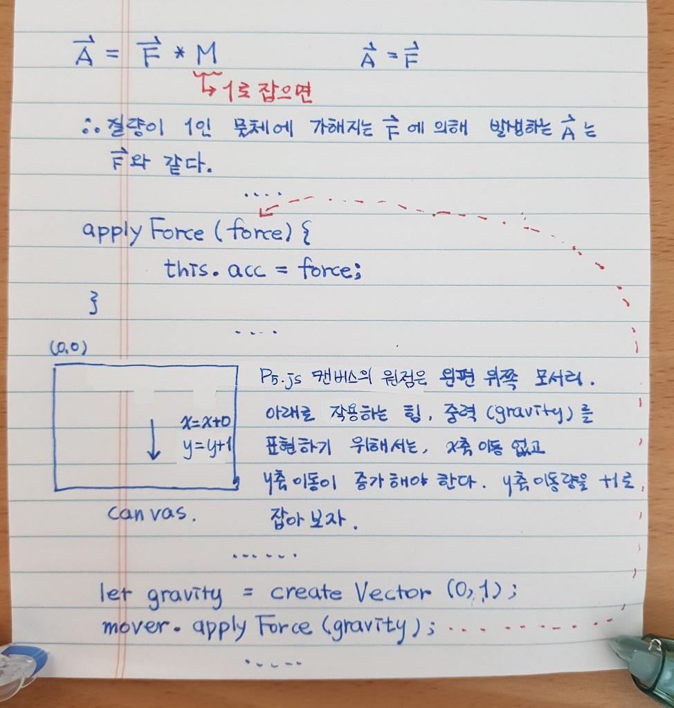 //벡터 중력은 x축 작용은 없고 y축 아래방향으로 작용(p5.js 캔버스의 원점은 왼편 위쪽 모서리이므로, y 값의 증가는 아래방향으로의 이동을 의미한다.)