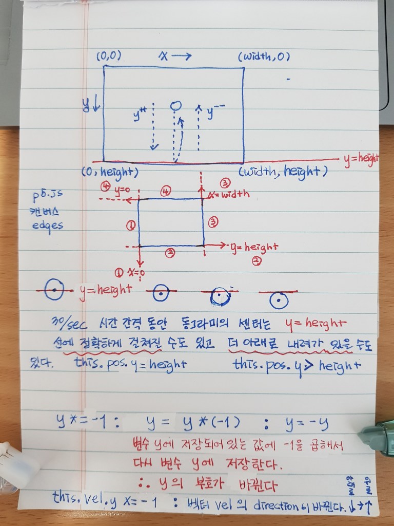 동그라미가 바닥, 즉, 아래쪽 가장자리 y = height 에 걸치거나 더 아래로 내려가면 (시간 간격이 30/sec 라서 그 사이에 동그라미가 바닥 아래로 내려가 있을 수도 있습니다) 동그라미를 바닥에 위치시키고 위로 움직이도록 만듭니다. 다시 중력의 영향으로 내려오다 바닥에 닿으면 다시 위로 움직입니다.