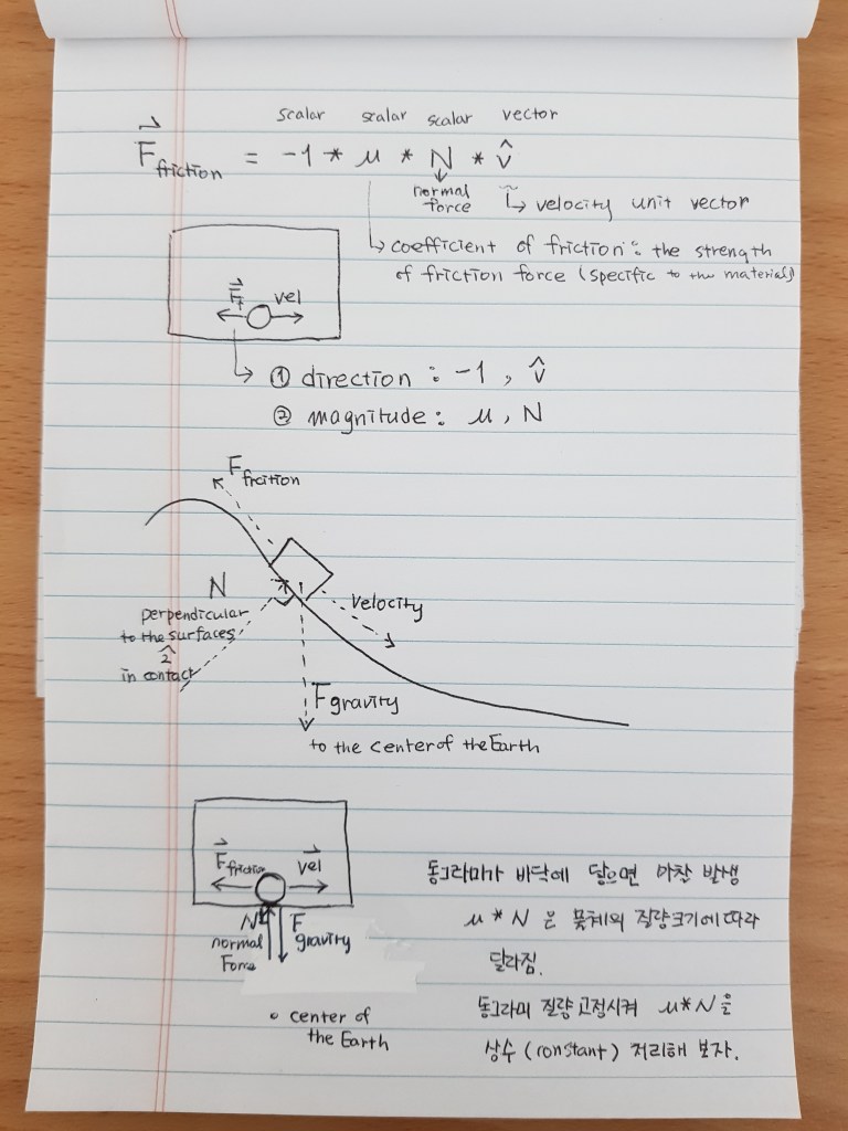 동그라미가 바닥에 닿을 때의 접촉면과 직각 방향으로 작용하는 Normal Force의 크기는 동그라미의 질량의 크기에 따라 달라집니다. 우리는 동그라미의 질량을 고정시켜 Normal Force의 크기도 고정시켜 상수(constant)로 다루기로 해요~^^*