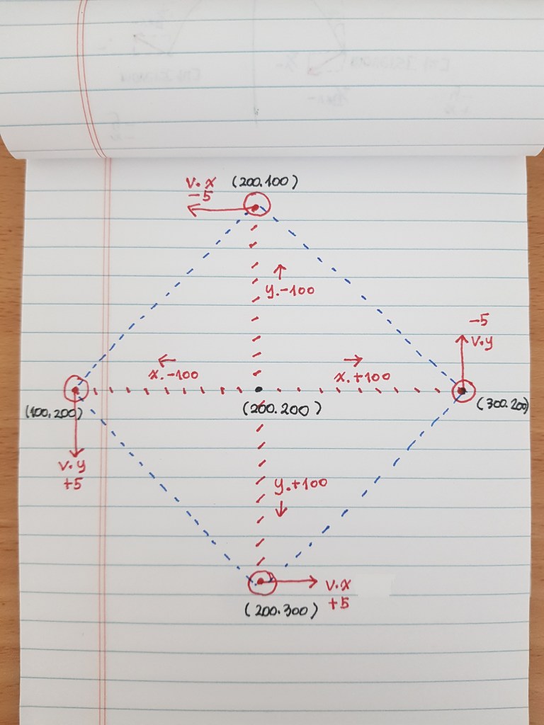 네~ 그래요~ 꼭지점 좌표는 중심(200,200)에서 x축 +-100 y축 +-100 이동한 곳이면 되겠지요~^^*? (100, 200) (200, 100) (300, 200) (200, 300) 으로 좌표값을 부여해 볼게요~^^* 노트를 참고해 보셔도 좋겠지요~^^*?