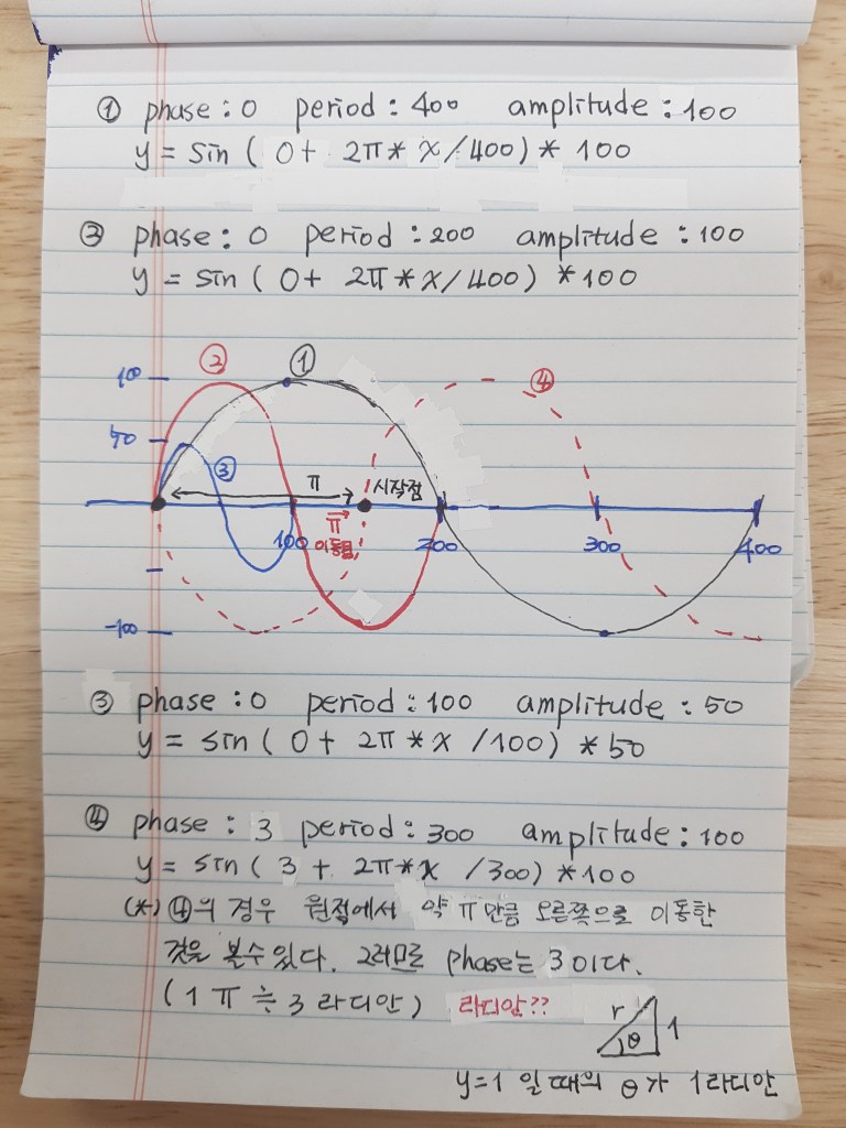 그 관계에 익숙해 지기 위해, 노트에 사인 곡선들을 그리고, 그 곡선들을 p5.js 캔버스에도 그려보겠습니다.