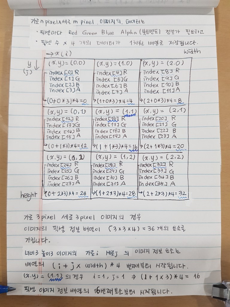 이미지의 픽셀 위치에 대한 이차원 배열과, 각 위치의 픽셀의 칼라정보를 담은 일차원 배열 관계를 노트에 정리해 보았어요~~^^*