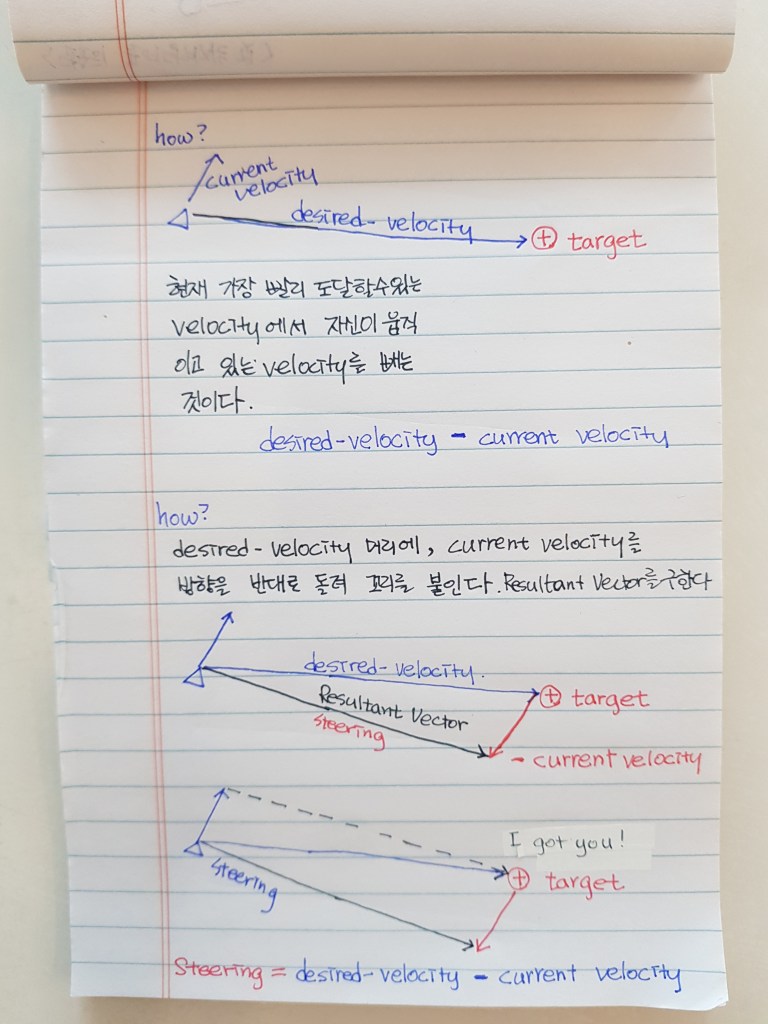 가장 빠르게 target에게 도달할 수 있는 속도 desired_velocity에서 현재 autonomous agent가 움직이는 데 반영되고 있는 속도 current_velocity를 뺀 것이, autonomous agent가 몸을 트는 steering 속도가 된다는 것이었는데요~^^*