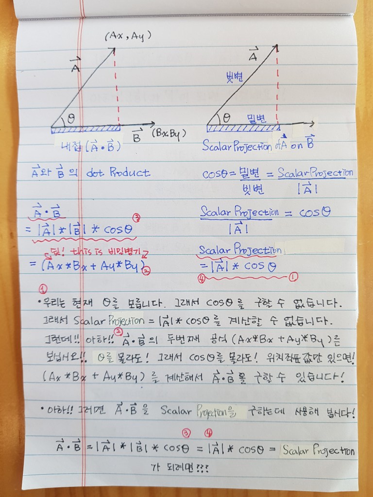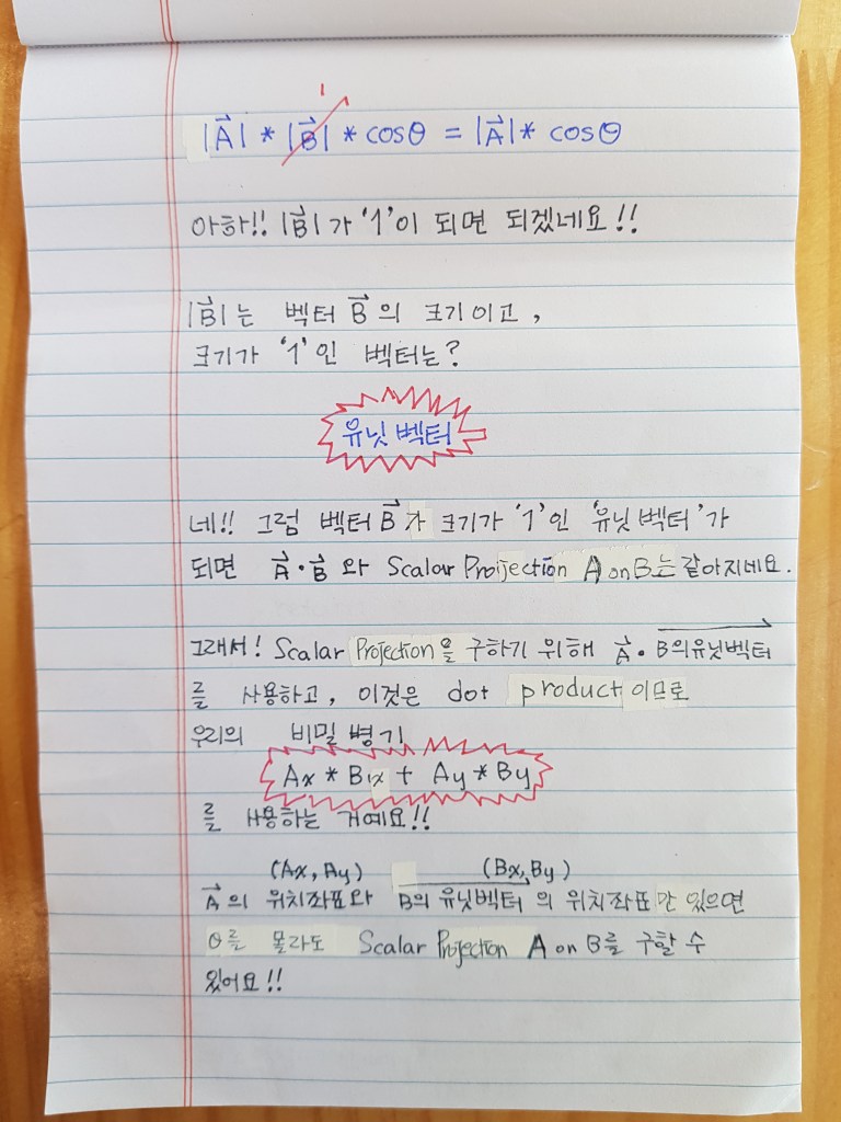 Scalar Project는 벡터 B를 유닛벡터로 만든 후, 벡터 A와 유닛벡터 B의 Dot Product와 같다는 것을 노트 정리해 보았습니다~~^^*