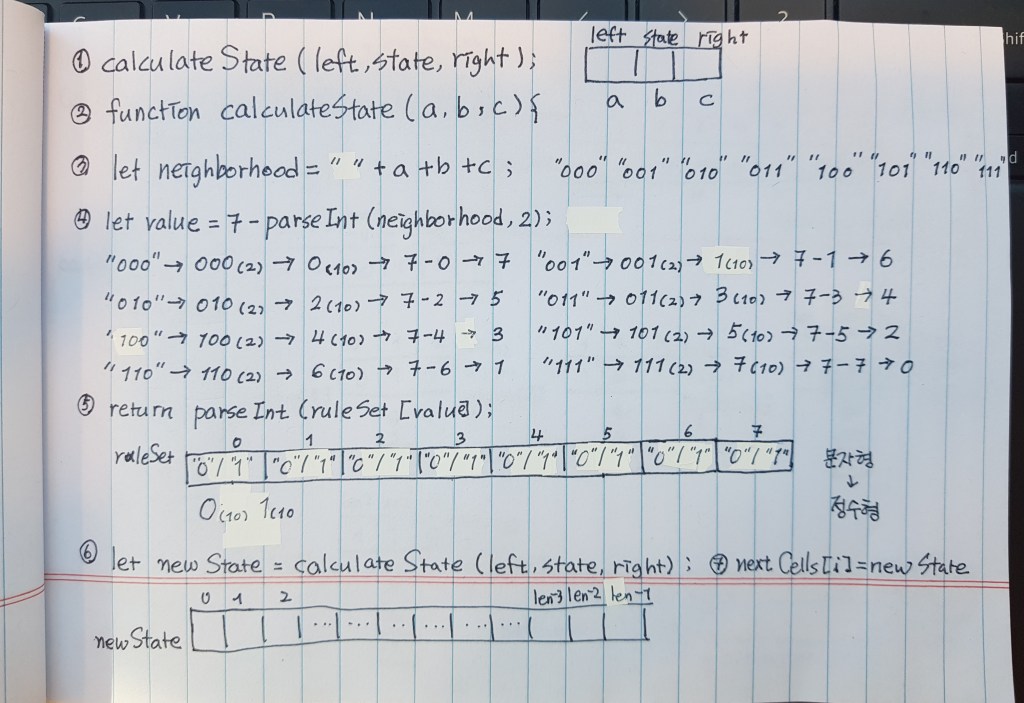 [왼쪽이웃-나-오른쪽이웃] => 이진수 => 십진수 => 7에서 빼기 => ruleSet[]
