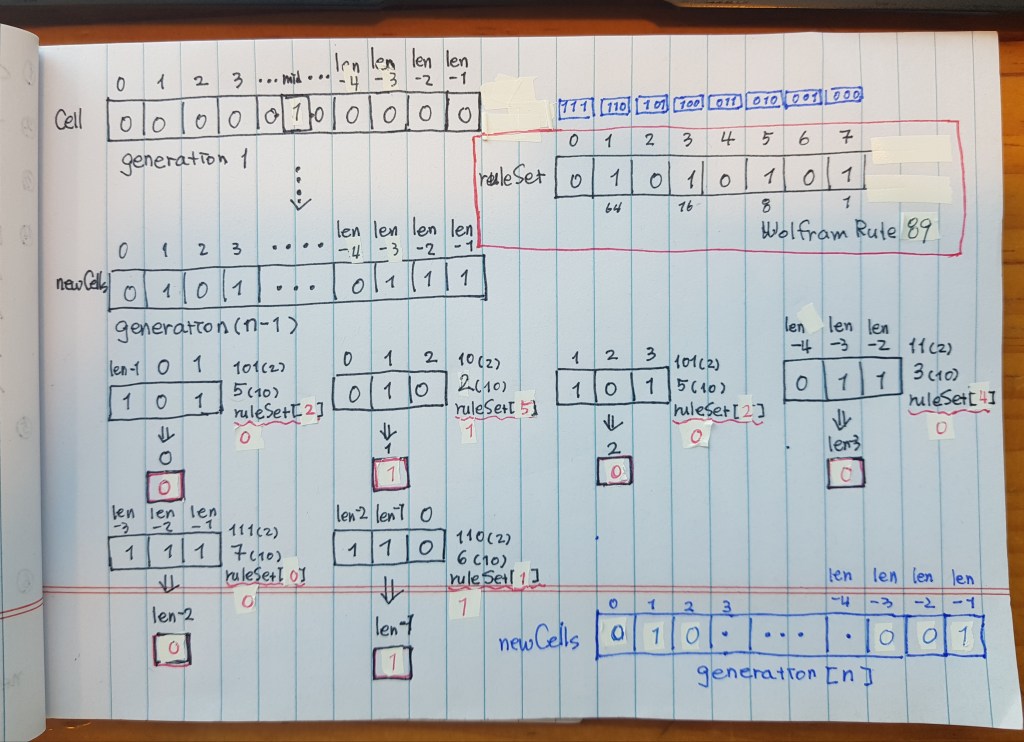 ruleSet은 8자리 이진법 형태로 되어 있어서, 맨 앞자리 ruleSet[0] 의 가중치가 가장 높고 ruleSet[7]의 가중치가 가장 낮아요. 그래서, [왼쪽이웃-나-오른쪽이웃] 값이 가장 큰 것이 ruleSet[0], 가장 작은 것이 ruleSet[7]과 호응하도록 만들고자 해요~