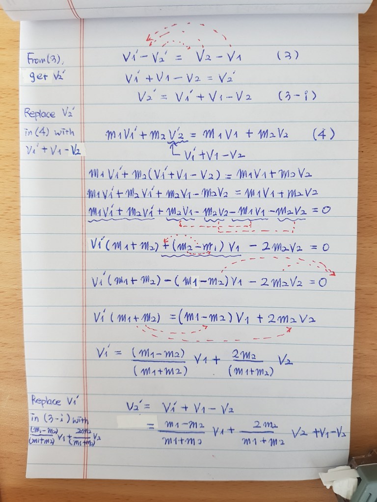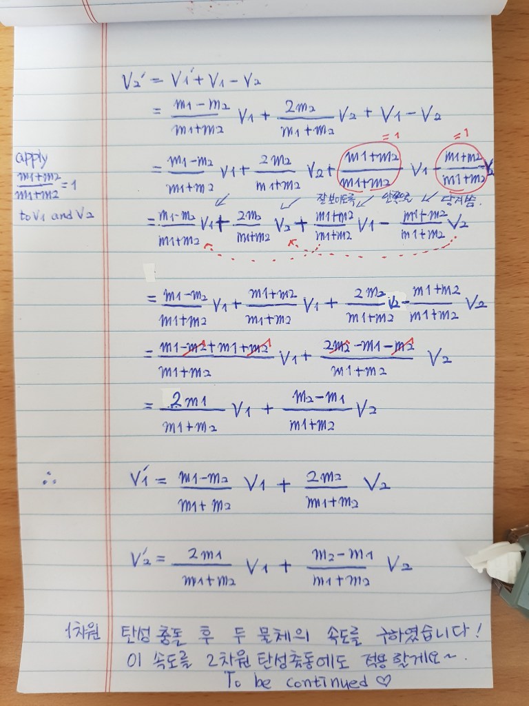 그리고, 1차 탄성 충돌 후의 두 물체의 속도는, 2차 탄성 충돌을 다룰 때 계속 적용될 것이라, 한 글자 한 글자 우리 스스로 식을 전개해 보는 것의 보람을 나중에 느낄 수 있을 것 같아요~~^^*