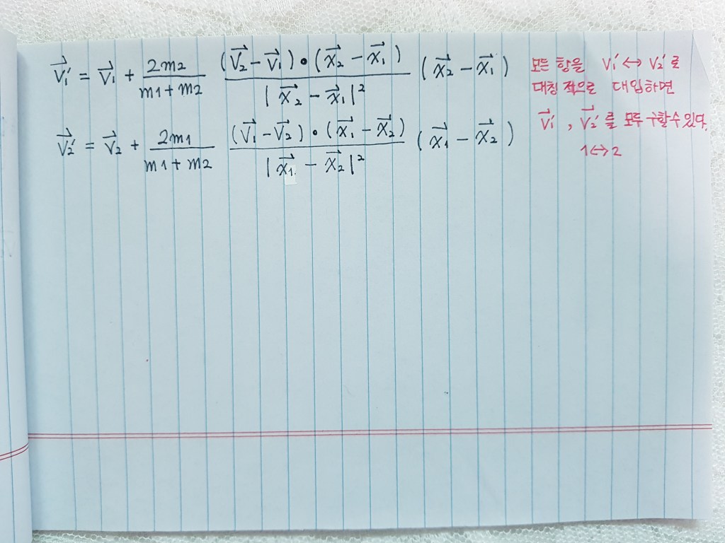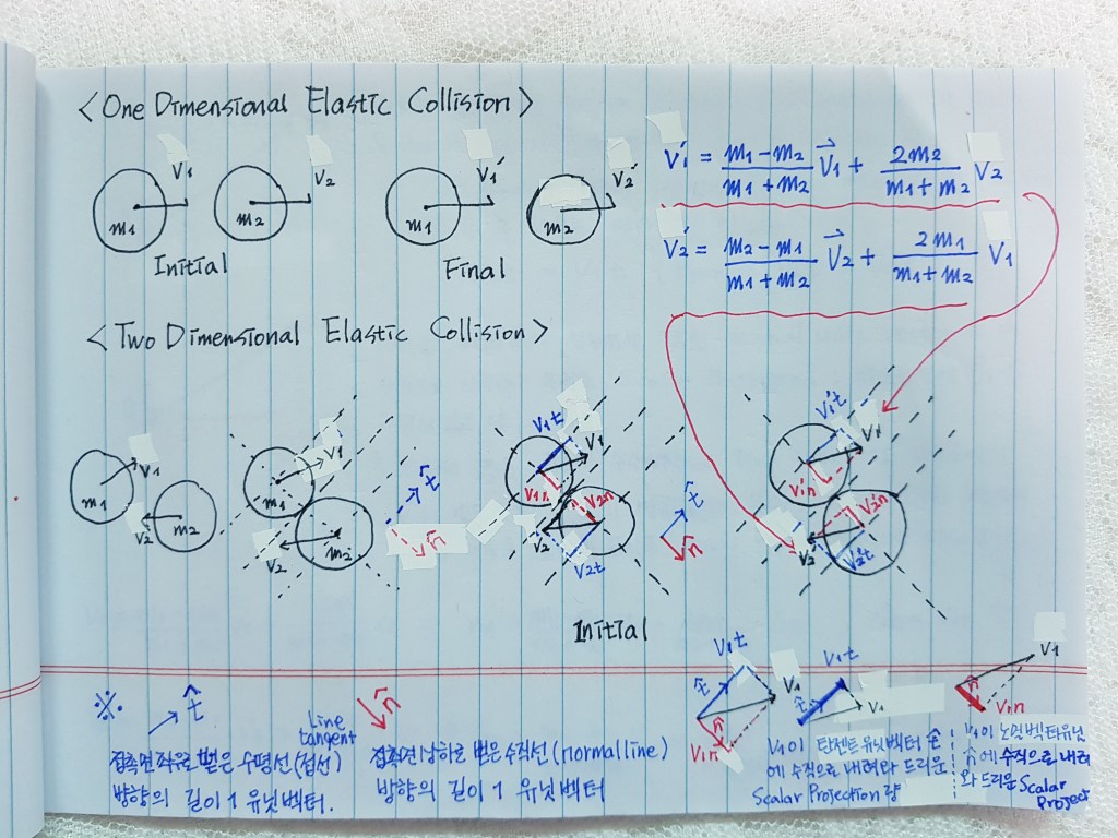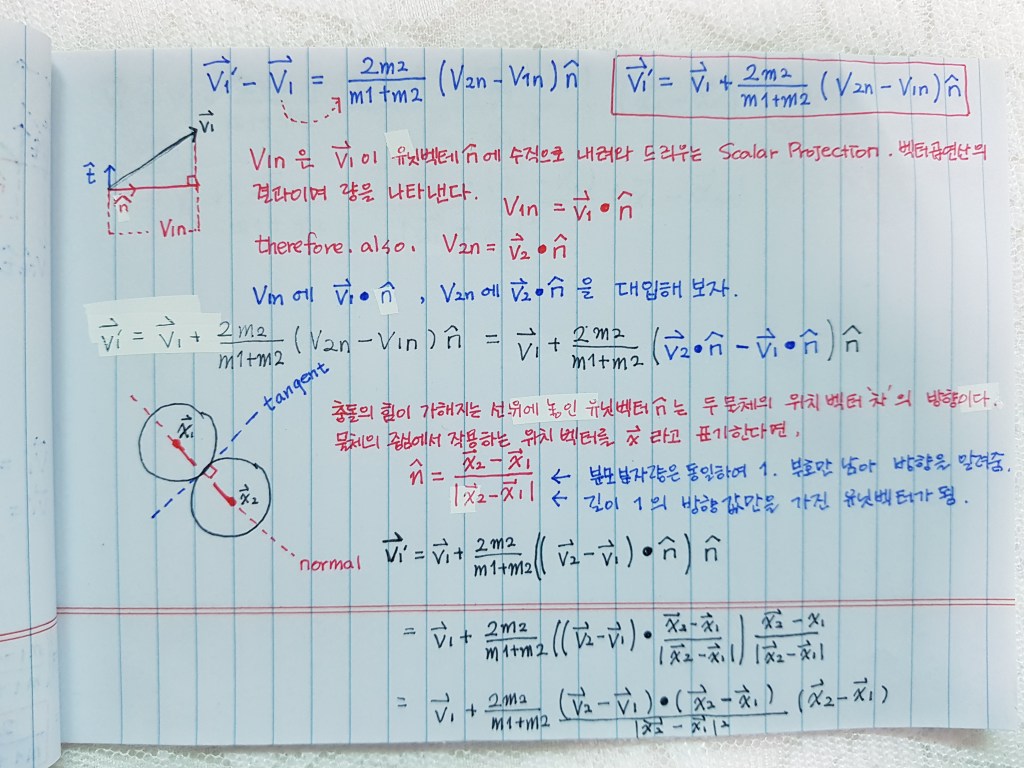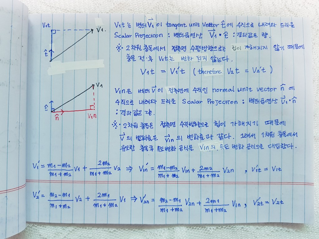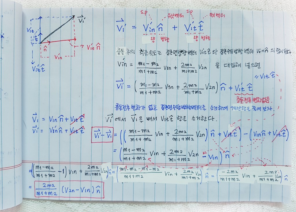 지금 2차원 탄성 충돌 후 두 물체의 속도 계산 유도 과정을 노트에 정리하고 있는데요~^^*