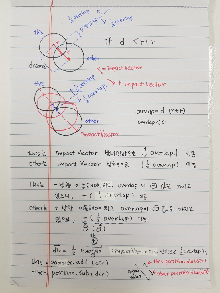 두 물체 사이의 거리가 두 물체의 반지름의 합보다 작다면, 충돌 후 영역이 겹쳐지고 있다는 의미이니까, 이때 두 물체를 뒤로 옮기도록 할게요. 두 물체 사이의 거리가 두 물체의 반지름의 합과 같도록요~~^^*
