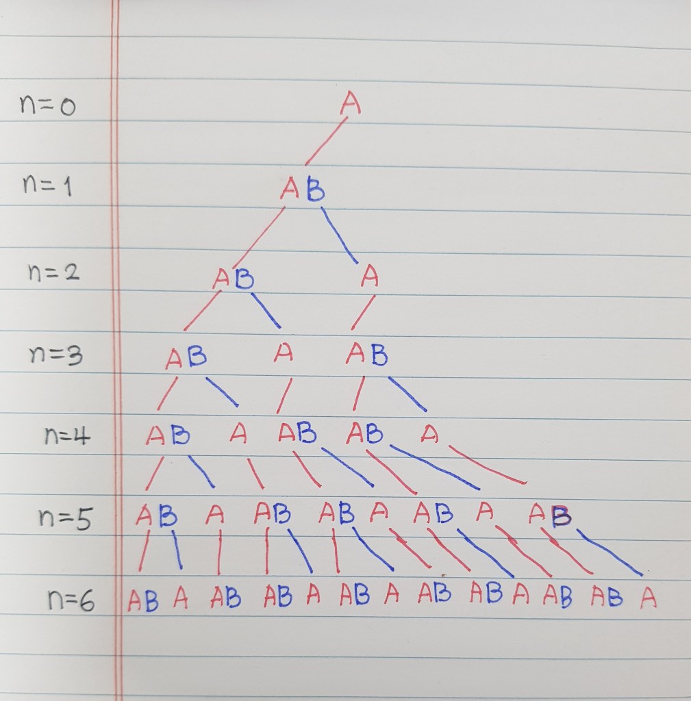 변수는 A와 B입니다. 상수는 없습니다. A로 시작합니다. A는 AB로 B는 A로 바뀝니다.