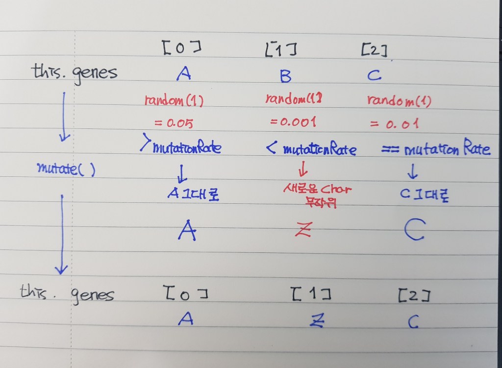 메인 파일인 sketch.js에서 글로벌 변수로 지정한 mutationRate를 클래스 DNA의 내장함수 mutate()에서 사용해 보겠습니다~^^*