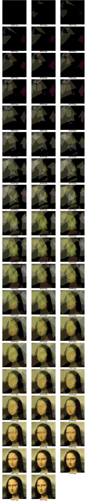 => 이 작품의 재미있는 부분: 50개의 반투명 다각형만을 사용하여 모나리자 복제품을 그릴 수 있는가?